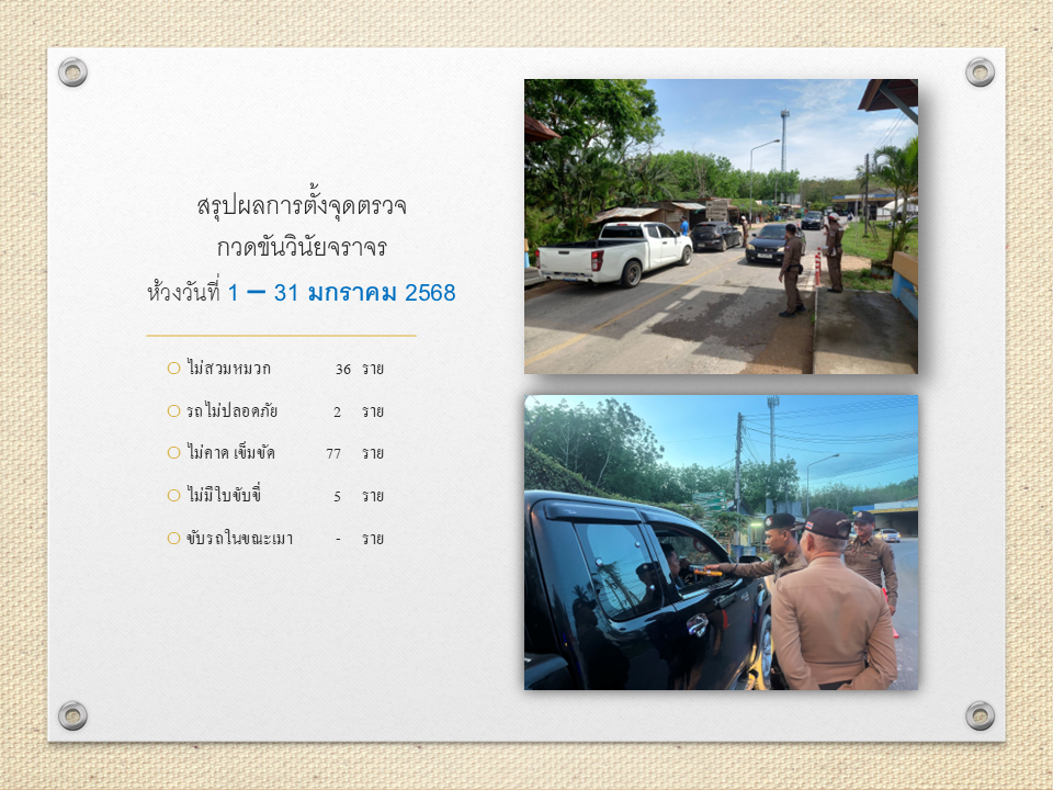 สรุปผลการตั้งจุดตรวจ กวดขันวินัยบจราจร ห้วงวันที่ 1 – 31 มกราคม 2568