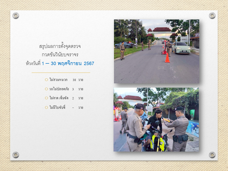 สรุปผลการตั้งจุดตรวจ กวดขันวินัยบจราจร ห้วงวันที่ 1 – 30 พฤศจิกายน 2567